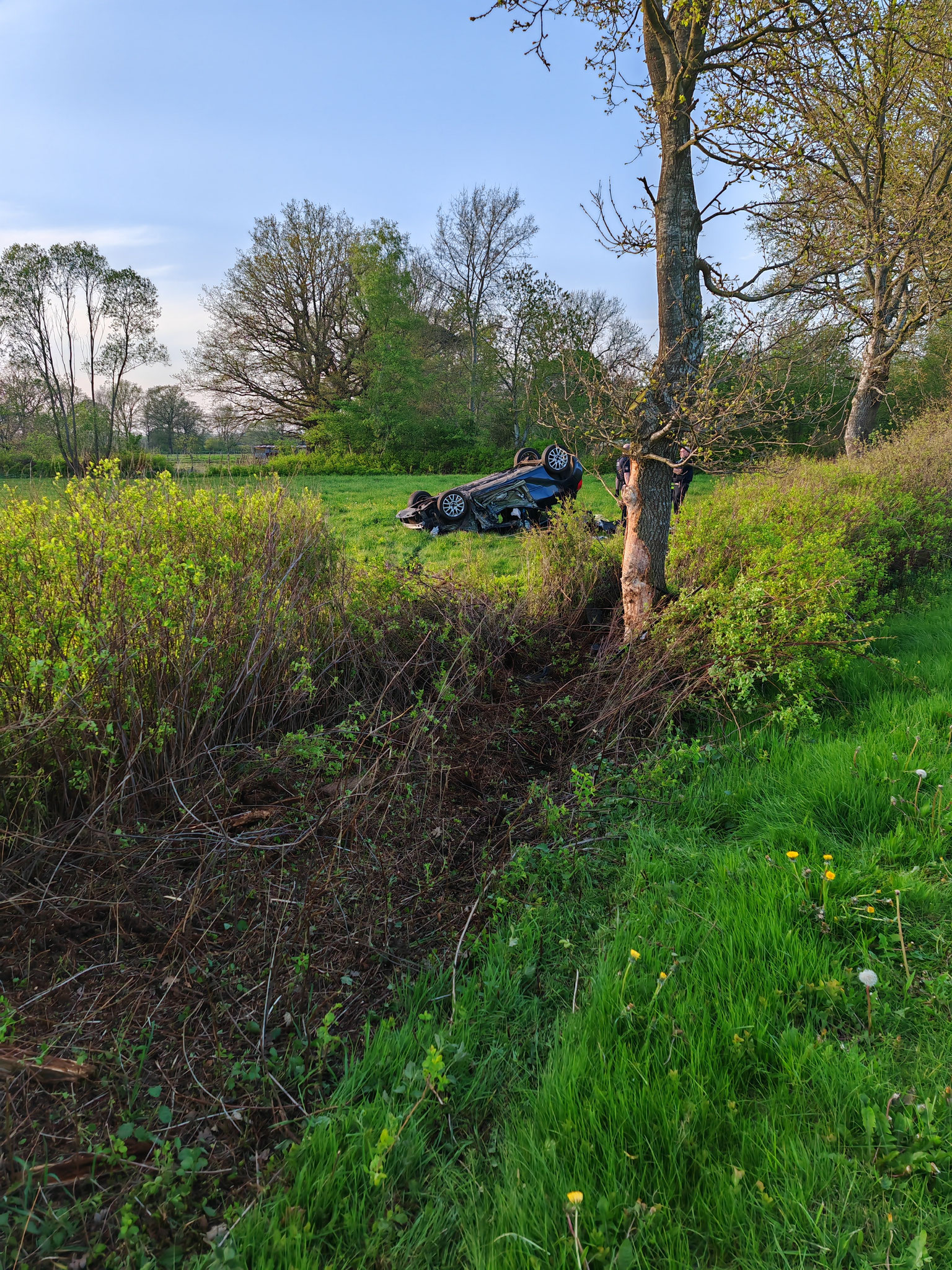 Aus ungeklärter Ursache ist ein PKW nach links von der Fahrbahn abgekommen und hat einen Baum touchiert, danach kam das Fahrzeug auf dem Dach liegend auf einem Feld zum stehen. Der Fahrer und der Beifahrer wurden von Ersthelfern aus dem Fahrzeug befreit. Wir versorgten die Verletzten bis zum Eintreffen vom Rettungsdienst und unterstützten bei der weiteren Versorgung und der Umlagerung. Nach der Unfallaufnahme stellen wir das Auto wieder auf die Räder damit es abgeschleppt werden konnte.