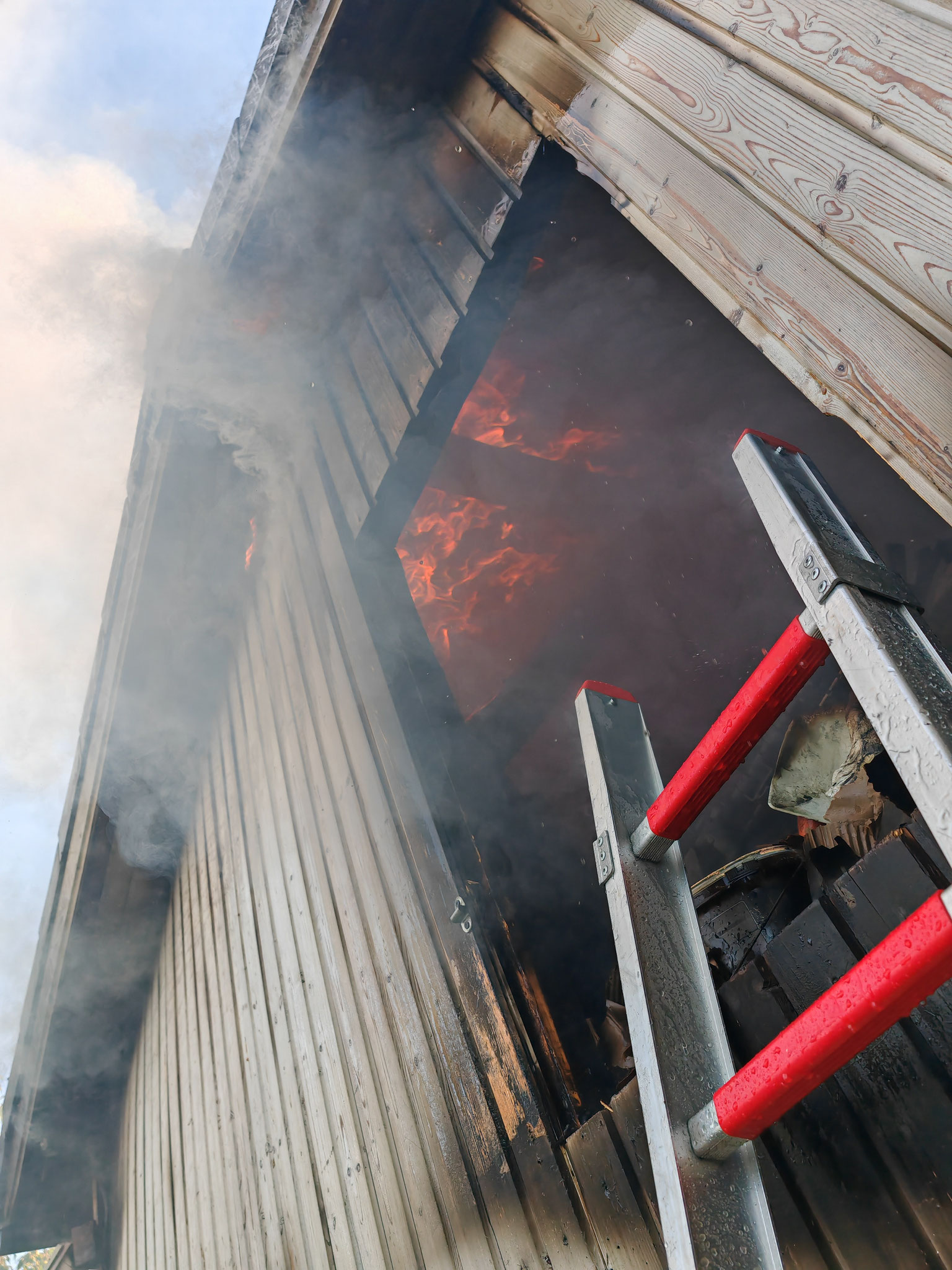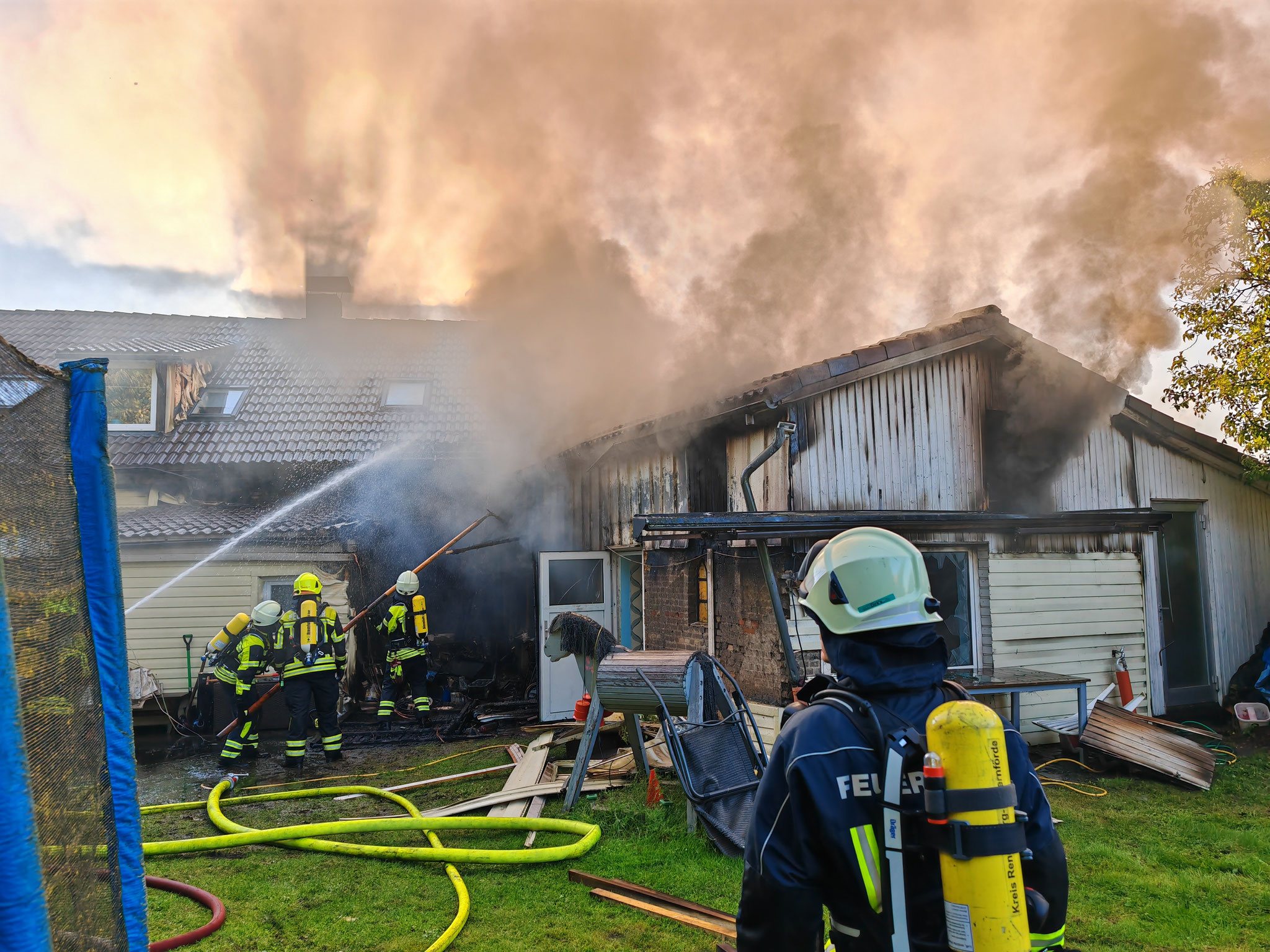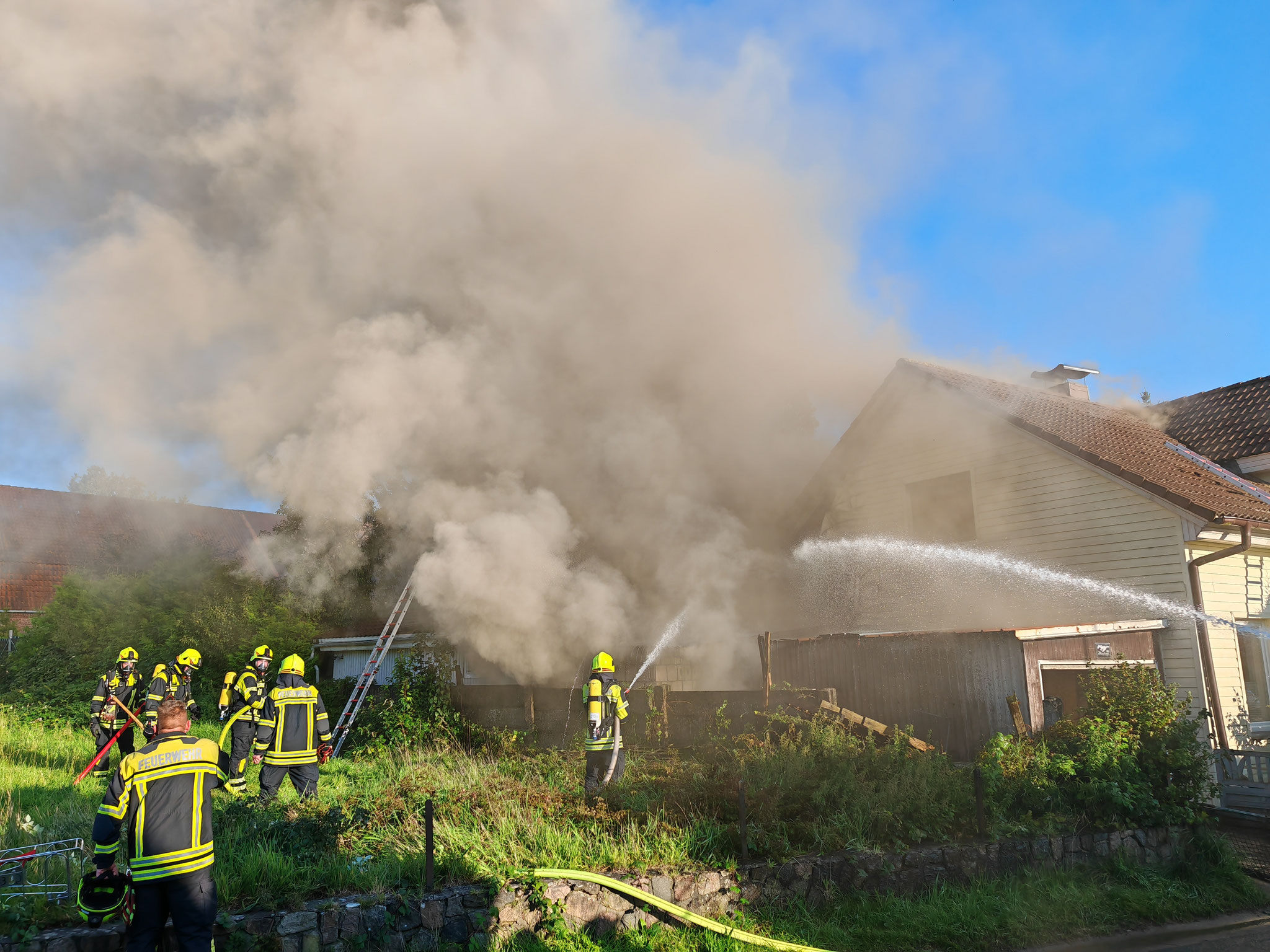 Ein Anbau an einem Gebäude war in Brand geraten, das Feuer drohte auch auf das Wohnhaus überzugreifen. Dies konnte jedoch verhindert werden. Die Ablöschmaßnahmen am Anbau gestalteten sich schwierig. Durch die dort gelagerten Gegenständen war das ablöschen der letzten Glutnester nicht möglich und so musste der obere Teil des Anbaus mit einem Bagger abgerissen werden.