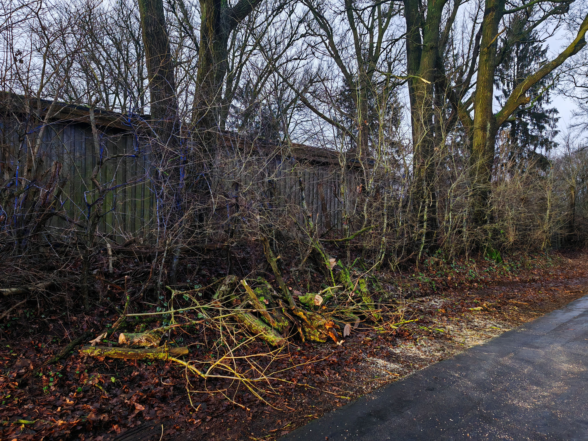 Mittels Kettensäge trugen wir den Ast Stück für Stück ab, nach dem reinigen der Fahrbahn konnte die Straße wieder friegegeben werden.